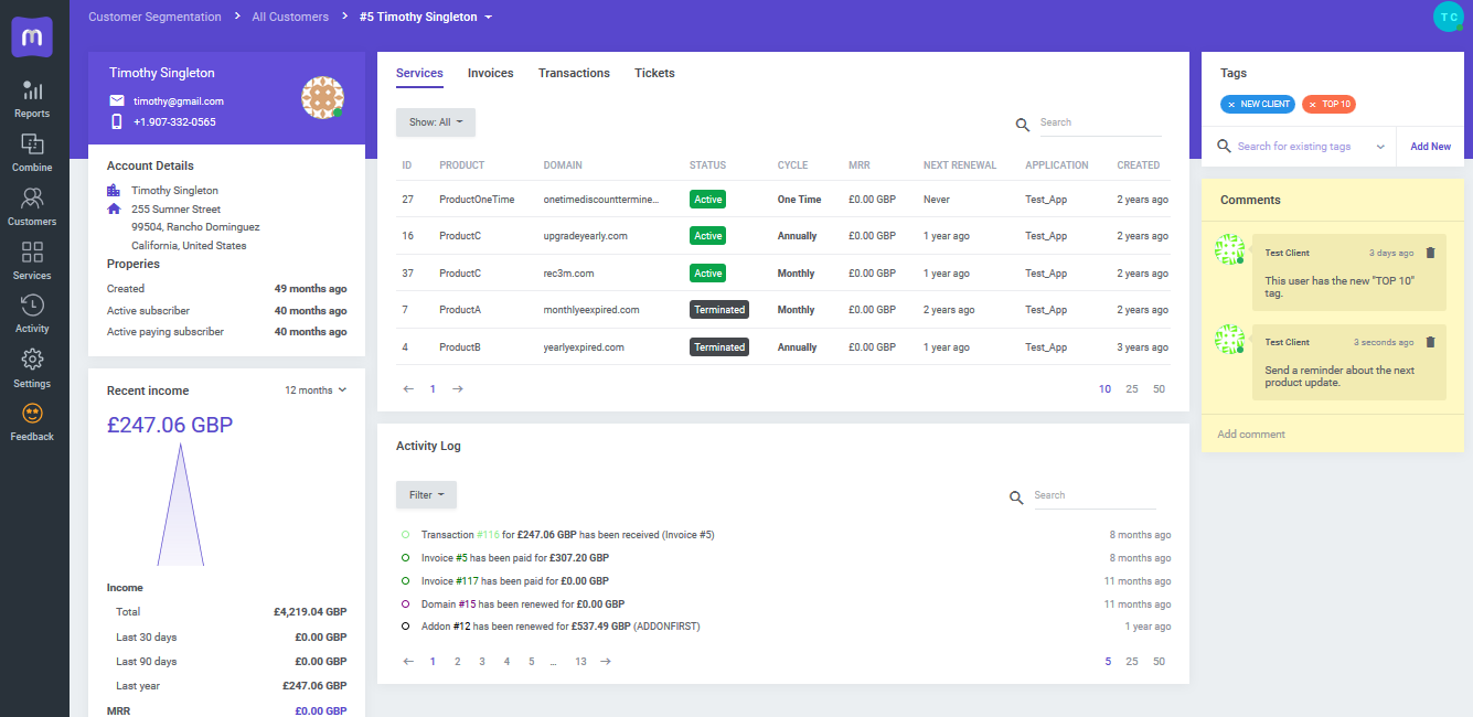 Starting from this point, you will be in a position to preview all key data on your customers as well as the services they own. In what manner exactly? Each time you hover over a particular name, a convenient tooltip will appear instantly with several smaller sections summarizing the client’s contact details, income, owned services as well as tags and added comments.